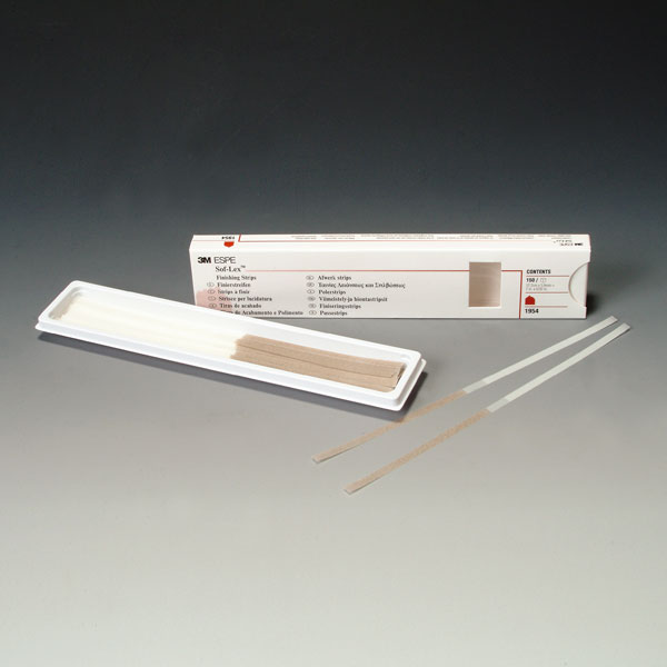Tiras para el acabado y pulido de los espacios interproximales. Cada tira está compuesta por una zona central neutra y dos granulometrías distintas.150 Tiras de grano grueso y medio 4 x 180 mm.