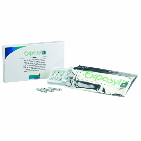 Es un sistema innovador de acceso a los límites cervicales. Destinado a la retracción gingival temporal, presenta numerosas ventajas. Expasyl no traumatiza los tejidos y preserva la estructura del epitelio, es indoloro y ergonómico. Expasyl permite obtener un campo clínico exento de cualquier desangramiento. Este sistema de apertura de los surcos es fi able, rápido y práctico. Expasyl garantiza una retracción regular y reversible de la encía. Este proceso elimina los inconvenientes de las técnicas habituales de retracción gingival. Composición: Cloruro de aluminio. Caolín. Excipientes.20 cápsulas de Expasy.