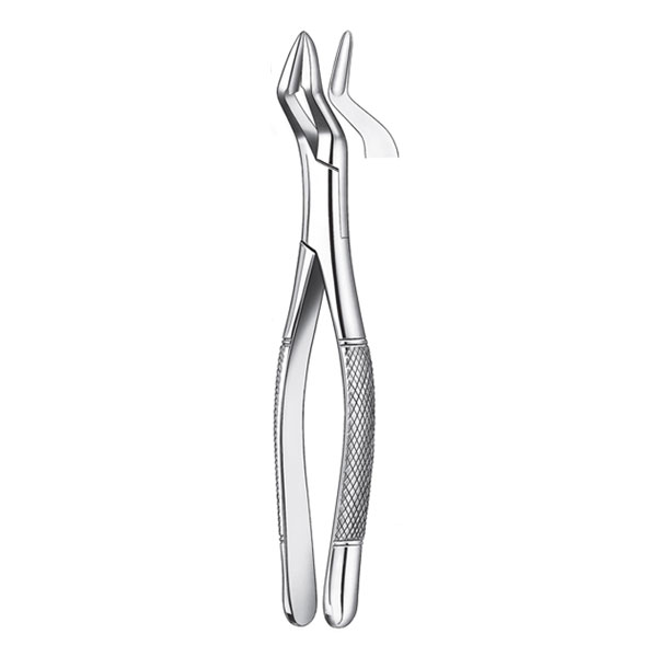 forceps de extracción, forma americana, alveolares para molares, premolares y raíces superiores, con pico angosto.