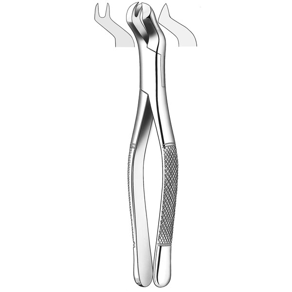forceps de extracción de acero sin níquel, según norma DIN 1.421, de alta calidad y templados al vacío. Superficie con pulido electrolítico que proporciona una alta resistencia a la corrosión. Puntas delgadas que se ajustan a la forma anatómica del diente. Su mango se adapta ergonómicamente a la mano y sus estrías garantizan una firme sujección. El tornillo de unión está insertado pneumáticamente. Anillo de teflón de larga duración que garantiza una apertura suave. Esterilizables en autoclave.forma americana. Para molares superiores, lado derecho.