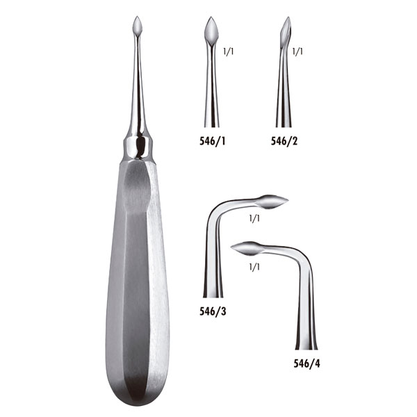 Elevadores para raíces.· puntas de trabajo delgadas y estilizadas.· la punta permite un acceso óptimo al resquicio alveolar también por interproximal.· la punta de flecha con una ligera depresión favorece una buena rotación de la palanca en el resquicio alveolar.· la forma acodada (Nº 546/2) resulta muy indicada para la zona distal.· las formas 546/3 + 4 tienen una angulación de 90° y están concebidas especialmente para utilizarlas por el lado lingual en la mandíbula.