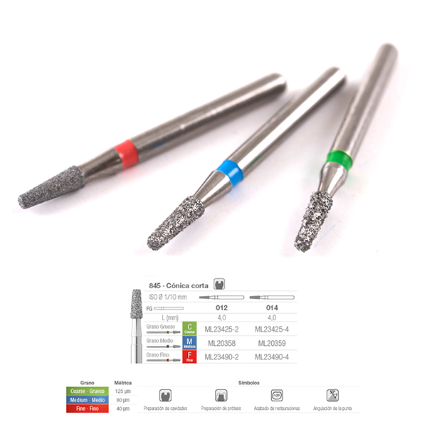 fRESA DE DIAMANTE fG PARA TURBINA CON fORMA DE CONO CORTO DE DIAMETRO 012 Y TAMAÑO DE GRANO GRUESO (COLOR VERDE).PRESENTACION EN BLISTER DE 5 UNIDADES.VELOCIDAD RECOMENDADA ENTRE 55000 Y 110000 RPM.