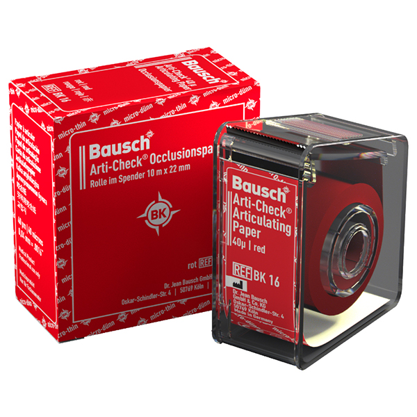 Papeles de oclusión microfinos de 40 ?m. son papeles muy finos recubiertos por ambas caras con tintas líquidas. Debido a su pequeño grosor, estos papeles muestran un comportamiento de marcado extremadamente preciso. De este modo, se reducen significativamente los contactos defectuosos o borrosos.Su recubrimiento especial con tintas líquidas permite marcar claramente todos los contactos oclusales, incluso sobre materiales difíciles de comprobar, como las cerámicas, las aleaciones metálicas, las resinas y las superficies oclusales humedecidas con saliva.Su recubrimiento cromático especial consiste en una infinidad de pequeñas microcápsulas rellenas de pigmentos.Incluso con una ligera presión de masticación, las cápsulas se abren y liberan el color de forma claramente visible. También permiten marcar de forma repetida, ya que el recubrimiento de color posee un volumen de tinta elevado.Rollo en dispensador. Color rojo. 16 mm de ancho. Contiene 15 m.