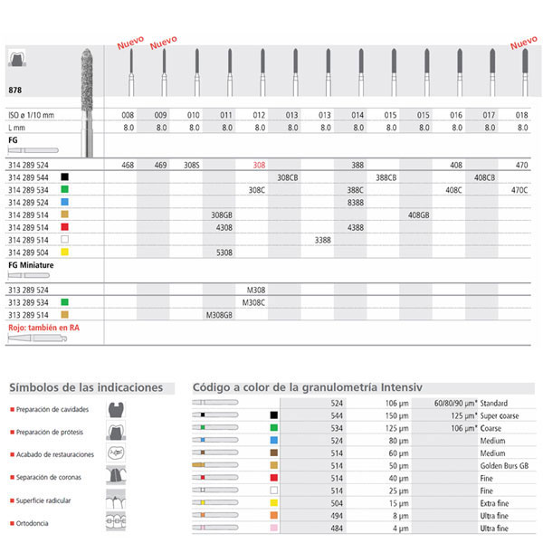 fresas de diamante y carburo-tungsteno de alta calidad. Acabado muy uniforme, de bajo desgaste y duración muy superior a otras marcas (2-3 veces más). Eliminación de restos mejorado y optimas propiedades de enfriamiento. Tipos de Turbina, Contra-ángulo y Pieza de mano.Caja de 6 unidades.