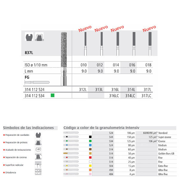 fresas de diamante y carburo-tungsteno de alta calidad. Acabado muy uniforme, de bajo desgaste y duración muy superior a otras marcas (2-3 veces más). Eliminación de restos mejorado y optimas propiedades de enfriamiento. Tipos de Turbina, Contra-ángulo y Pieza de mano.Caja de 6 unidades.