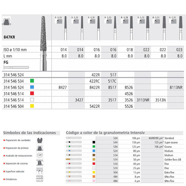 fresas de diamante y carburo-tungsteno de alta calidad. Acabado muy uniforme, de bajo desgaste y duración muy superior a otras marcas (2-3 veces más). Eliminación de restos mejorado y optimas propiedades de enfriamiento. Tipos de Turbina, Contra-ángulo y Pieza de mano.Caja de 6 unidades.