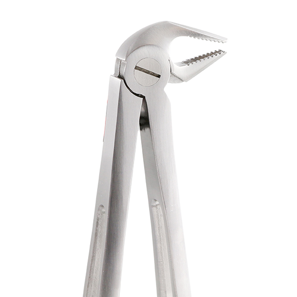 El nuevo diseño ligero, fino, delgado y aplanado lateralmente de la parte activa (o pico) del forceps hace posible un agarre profundo del diente hasta el alveolo, así como un óptimo movimiento de rotación proximal. El borde dentado con angulación distal permite un cómodo desplazamiento hasta el cuello del diente. La nueva estructura dentada ofrece un apoyo perfecto para efectuar movimientos de rotación y tracción del diente.