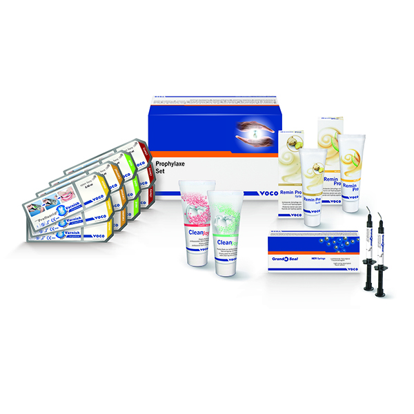 Set CleanJoy tubo 2 × 100 grs. (gruesa, fina), Remin Pro tubo 40 grs. melón, Remin Pro forte tubo 40 grs. jengibre, Profl uorid Varnish SingleDose 12 × 0,4 ml (de cada 3 × melón, caramelo, menta, cereza), Grandio Seal jeringa 2 × 2 grs.
