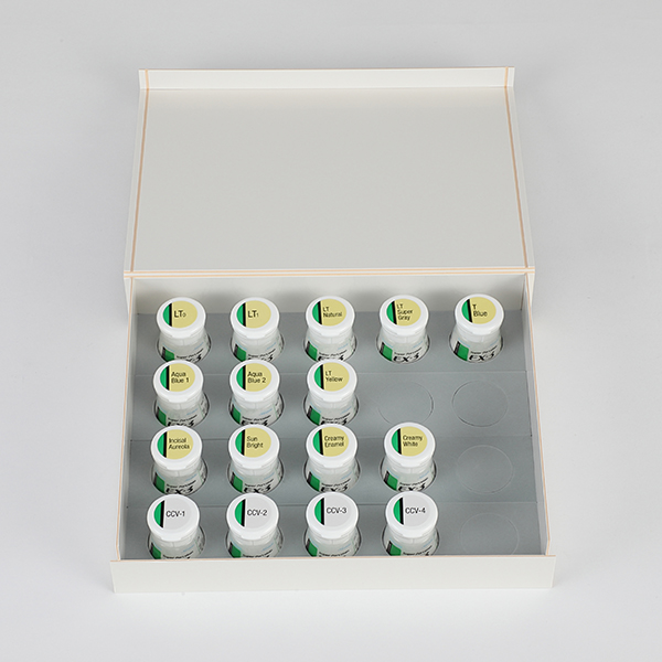Presentación: 7 colores 10 gr.: T Blue, LT0 (Luster T0), LT1 (Luster T1), Creamy Enamel, Sun Bright, Incisal Aureola, Creamy White, LT Natural, LT Yellow. Kit de Porcelana Luster para sistema EX3. Porcelana Luster (translucidos opalescentes) esta diseñada para recrear las sutiles complejidades del color y textura del esmalte natural. Debido al fino tamaño de las partículas que la componen, la porcelana Luster puede lograr un reflejo selectivo, lo cual asegura una Opalescencia que luzca como el diente natural. La Porcelana Luster Noritake exhibe un mínimo desgaste en la boca debido a partículas mas pequeñas y consistentes, dando por resultado un menor desgaste de los dientes antagonistas.