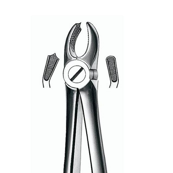 forceps de extracción de acero sin níquel, según norma DIN 1.421, de alta calidad y templados al vacío. Superficie con pulido electrolítico que proporciona una alta resistencia a la corrosión. Puntas delgadas que se ajustan a la forma anatómica del diente. Su mango se adapta ergonómicamente a la mano y sus estrías garantizan una firme sujección. El tornillo de unión está insertado pneumáticamente. Anillo de teflón de larga duración que garantiza una apertura suave. Esterilizables en autoclave.Molares superiores izquierda.Modelo pequeño.