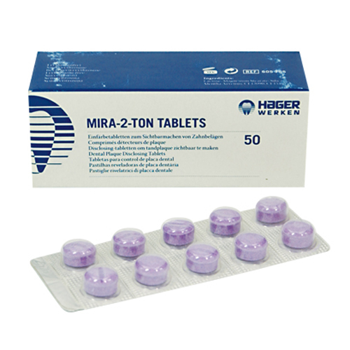 Pastillas de masticar para visualizar el sarro dental y motivar el cuidado en el paciente.- Distingue con seguridad el sarro dental nuevo del viejo.- El sarro viejo cambia a color azul, el más nuevo se pone de color rojo-lila.- fácil eliminación mediante cepillado dental normal.- Libre de eritrosina.- Color comestible puro y aprobado.