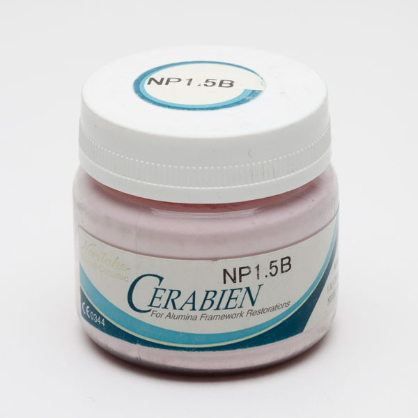 Presentación: Bote 50 gr. NP1.5B Dentina Cerabien. La cerámica Cerabien ha sido desarrollada especialmente para realizar coronas y puentes de cerámica sobre núcleos de alúmina. No produce reacciones alérgicas y elimina la posibilidad de líneas oscuras en el área cervical originadas por el metal. Además, utilizada conjuntamente con cerámica de hombros, controla la reflexión de la estructura de alúmina en el borde cervical, proporcionando restauraciones cerámicas con un efecto mas natural.