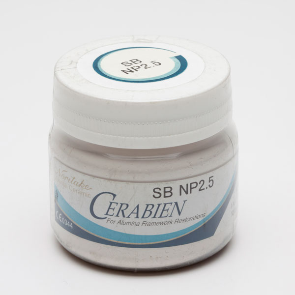 Presentación: Bote 50 gr. NP2,5SB Base Cerabien. La cerámica Cerabien ha sido desarrollada especialmente para realizar coronas y puentes de cerámica sobre núcleos de alúmina. No produce reacciones alérgicas y elimina la posibilidad de líneas oscuras en el área cervical originadas por el metal. Además, utilizada conjuntamente con cerámica de hombros, controla la reflexión de la estructura de alúmina en el borde cervical, proporcionando restauraciones cerámicas con un efecto mas natural.