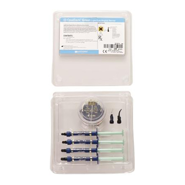 Barrera de resina fotopolimerizable?Protege el tejido blando con un sellado fiable.Aplicación directa.Extracción sencilla.Contenido:4 – 1,2 ml (1,34 g) de OpalDam Green jeringas10 – Micro 20 ga puntas10 – Black Mini puntas