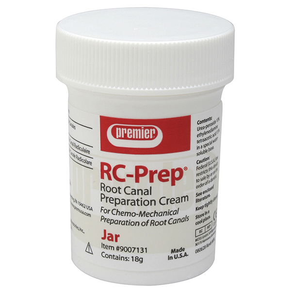 RC-Prep ideal para la preparación de canales intraradiculares. El gel RC-Prep por su única fórmula a base de glycol, péroxido de urea y Edta ayuda a desobturar calcificaciones y lubricar los canales intraradiculares, permitiendo una eficaz instrumentación y conseguir un buen tratamiento.frasco de 18 gr.
