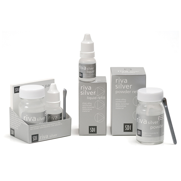 Material restaurador reforzado con aleación de plata sin mercurio y liberador de flúor.Kits de Polvo/Líquido Riva Silver.Botella de líquido Riva Silver de10g (8.9mL).Pote de Polvo Riva Silver de 32g.Accesorios.