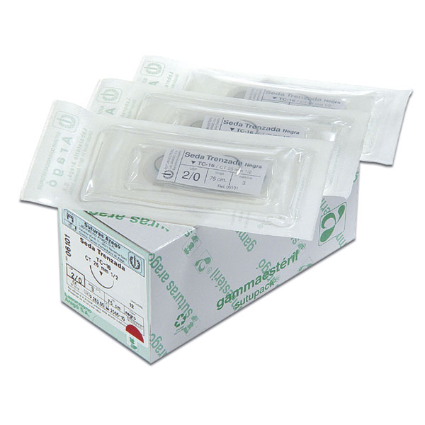 Sutura de seda natural trenzada, no absorbibles. Esterilizadas por Rayos Gamma. fácil anudabilidad y alta firmeza.Caja de 12 unidades.TC – 12. Aguja 1/2 círculo. 20 mm.Longitud de hebra 75 cm. USP 2/0. Métrico 3.