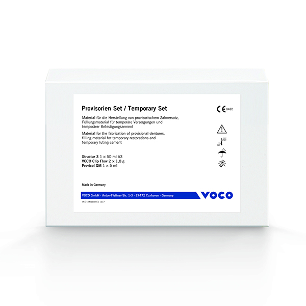 Para prótesis provisionales con brillo sin pulido.Restauraciones provisionales fotopolimerizables.Sin eugenol con efecto bactriostático y con hidróxido de calcio.Kit formado por: Structur 3, Provicol QM Aesthetic y Clip flow.